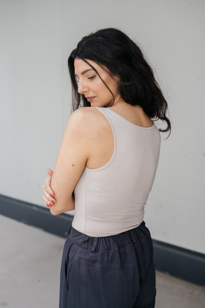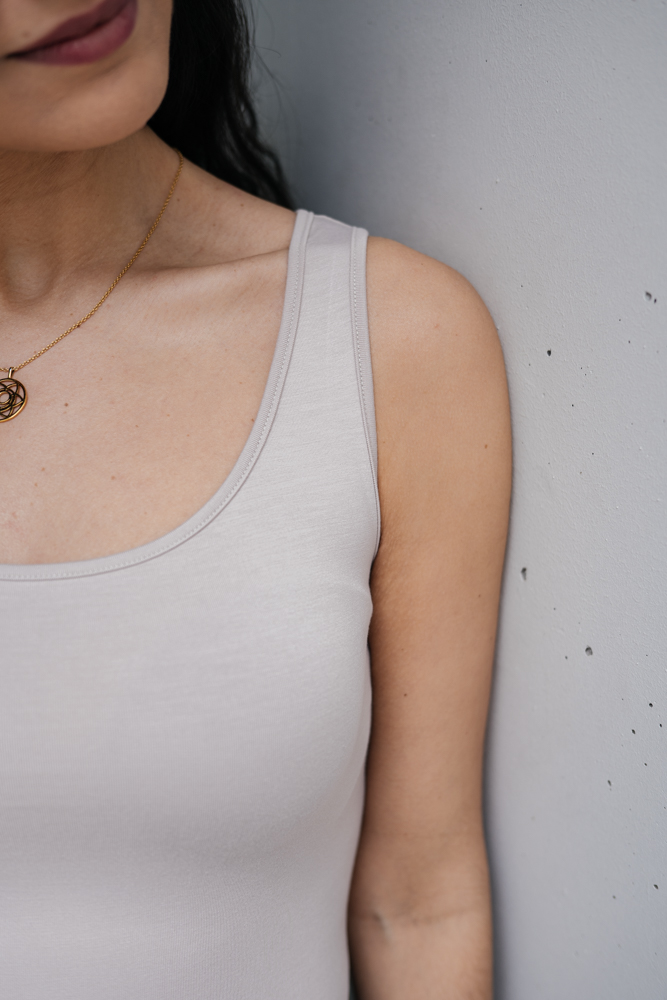 Tílka šijeme z nižší gramáže bambusu (210 g/m2), aby v nich bylo příjemně v létě i v zimě. Jsou krásně jemná a prodyšná.