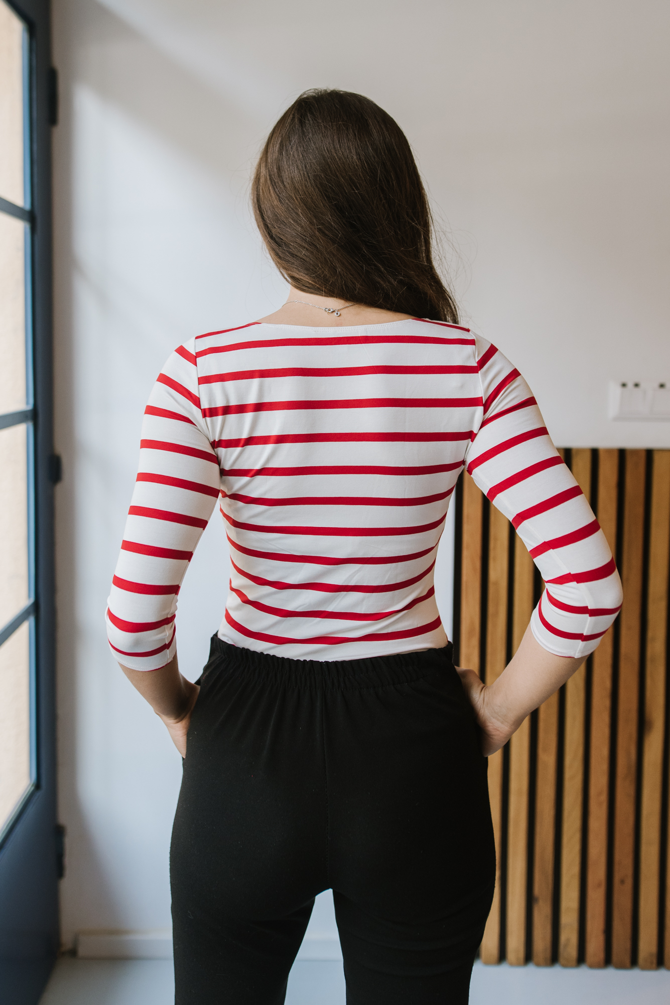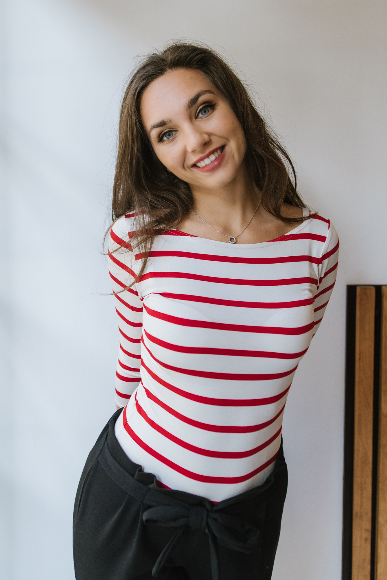 Tento střih trička má lodičkový výstřih. Univerzální, oblíbený, nadčasový typ výstřihu, který se hodí do každého šatníku.