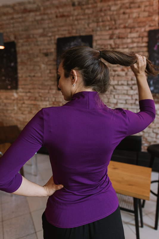 Spíš než tričko je to propracovaný top. Vzadu na krku zvednuté do stojáčku, na předním díle užší véčkový výstřih. střih Odetta působí velmi elegantně a žensky. Hodí se k sukni i ke kalhotám. Můžete ho nosit do práce i kdekoliv, kde se chcete cítit slavnostněji.