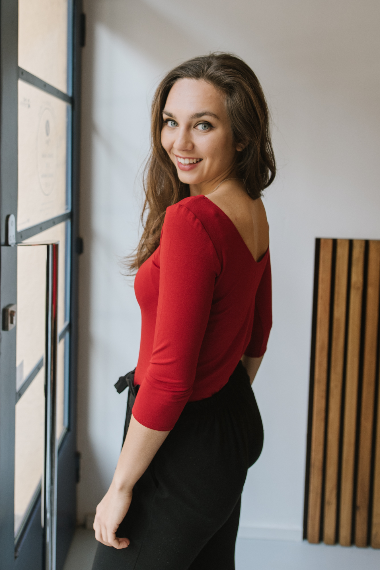 Při tvorbě tohoto střihu trička jsme se inspirovali v baletním trikotu. Rozálie má kulatý výstřih vepředu i vzadu na zádech.