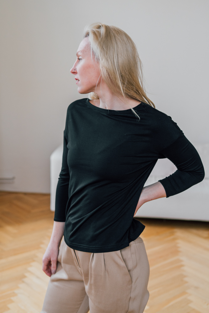 Pohodlné bambusové tričko je základ šatníku. Můžete ho zakasat, nechat volně nebo něco mezi – vepředu zastrčit, vzadu navolno.