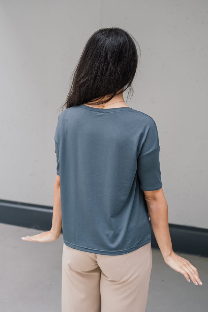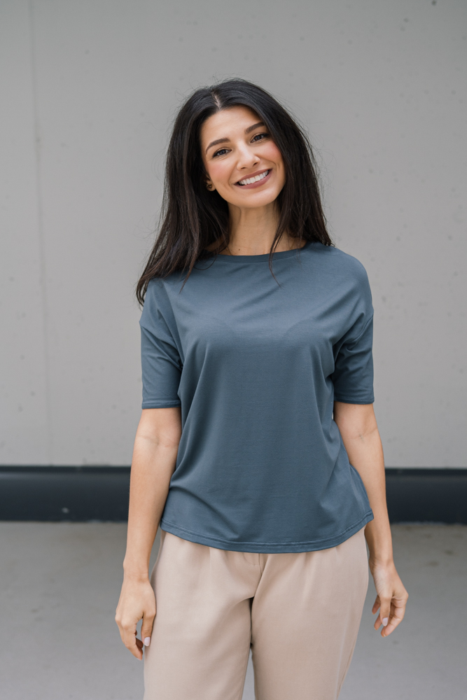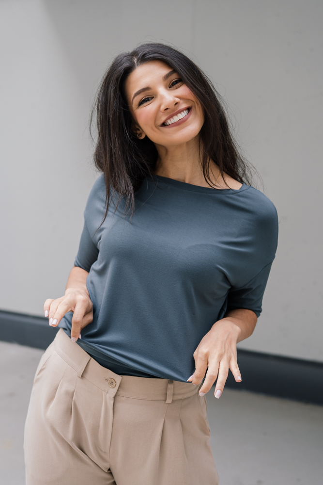 Pohodlné bambusové tričko je základ šatníku. Můžete ho zakasat, nechat volně nebo něco mezi – vepředu zastrčit, vzadu navolno.