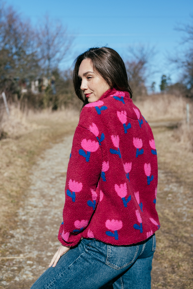 Bundička Polly je ušita z hebkého beránkového materiálu s výrazným květinovým vzorem, který rozzáří každý outfit. Jednobarevné díly dodávají moderní a promyšlený vzhled, zatímco měkký materiál příjemně zahřeje během chladnějších jarních dní.