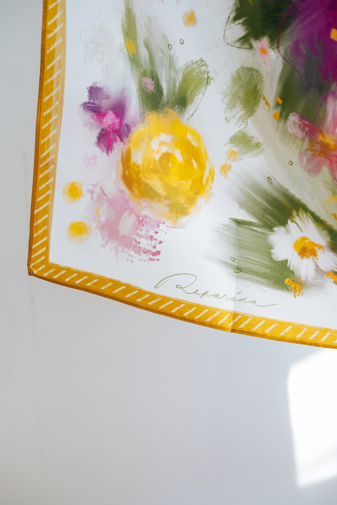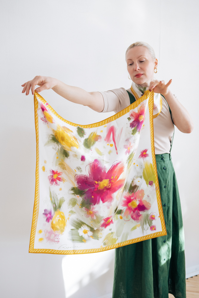 Hedvábný šátek šijeme z přírodního hedvábí, které je jemné na dotek a příjemné na nošení. Díky úpravě twill má lehce strukturovaný povrch, proto dobře drží tvar a snadno se váže. Autorský motiv je tištěný přímo na hedvábí.