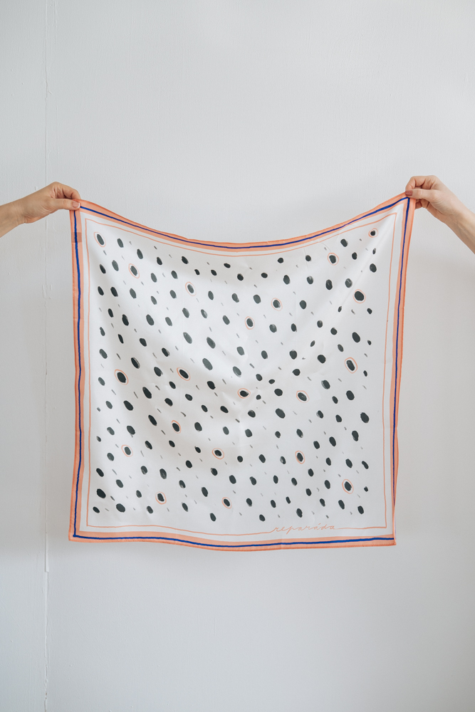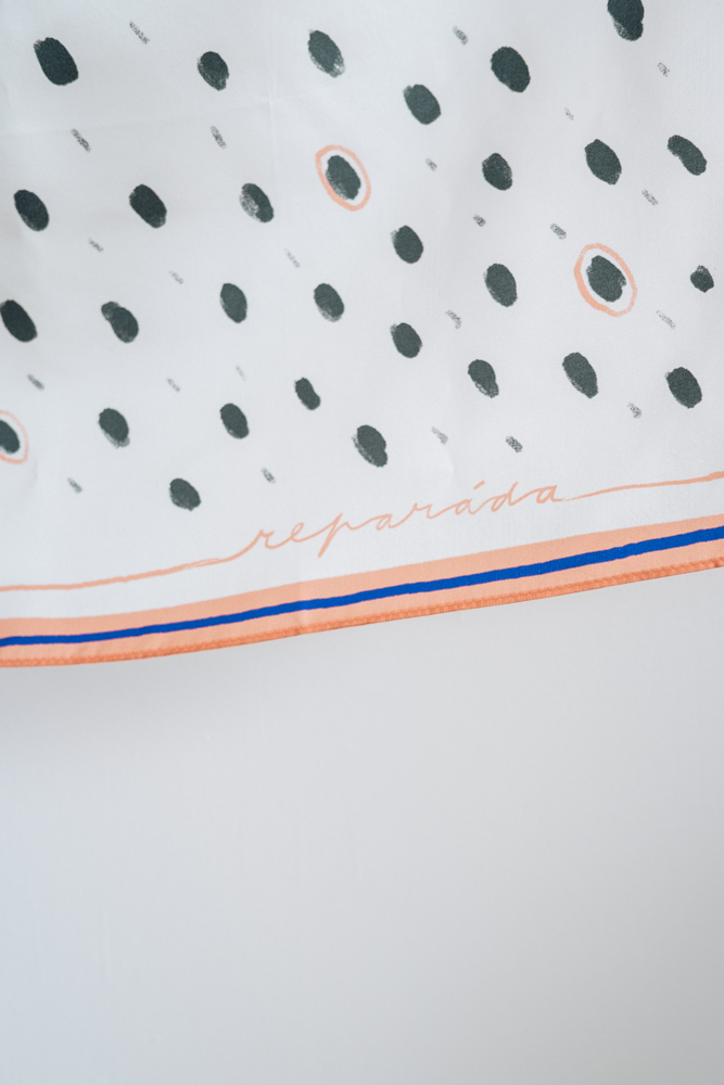 Hedvábný šátek šijeme z přírodního hedvábí, které je jemné na dotek a příjemné na nošení. Díky úpravě twill má lehce strukturovaný povrch, proto dobře drží tvar a snadno se váže. Autorský motiv je tištěný přímo na hedvábí.