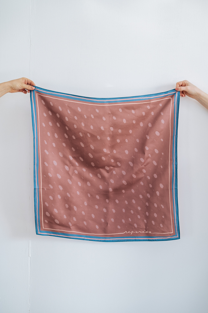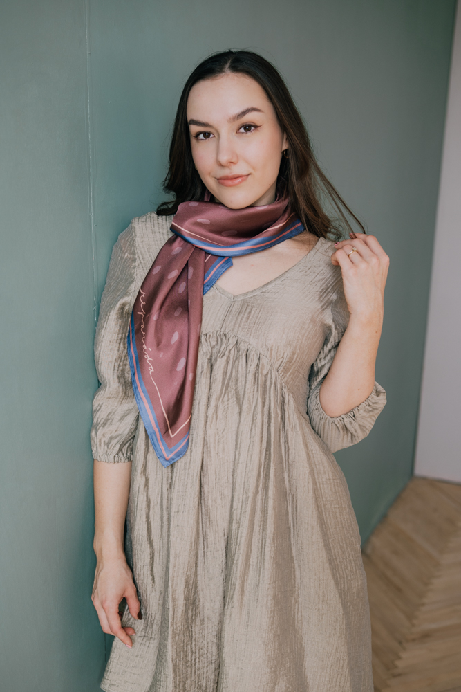 Hedvábný šátek šijeme z přírodního hedvábí, které je jemné na dotek a příjemné na nošení. Díky úpravě twill má lehce strukturovaný povrch, proto dobře drží tvar a snadno se váže. Autorský motiv je tištěný přímo na hedvábí.