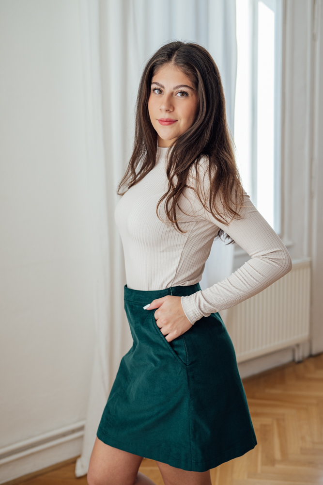 Sukně Nora se skvěle kombinuje s upnutými bambusovými tričky, ale skvěle k ní vypadají i halenky. Nahoru můžete obléct oversized sako nebo kratší bundičku.
