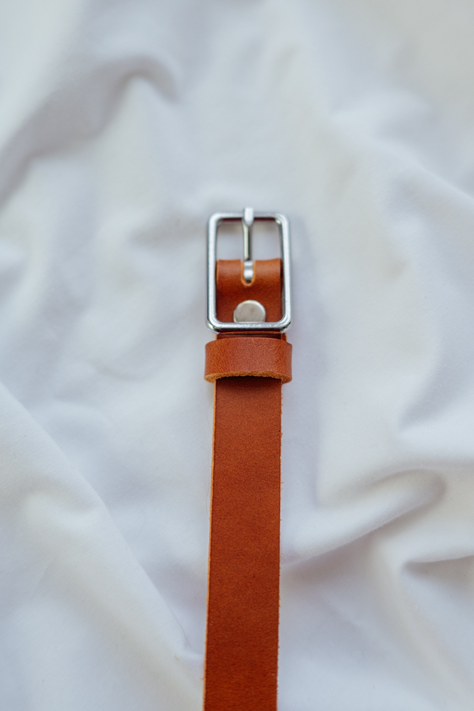 Třísločiněná hovězí kůže (to znamená činěná přírodními prostředky, bez chromu), síla kůže 2,5 mm, ručně barvená.