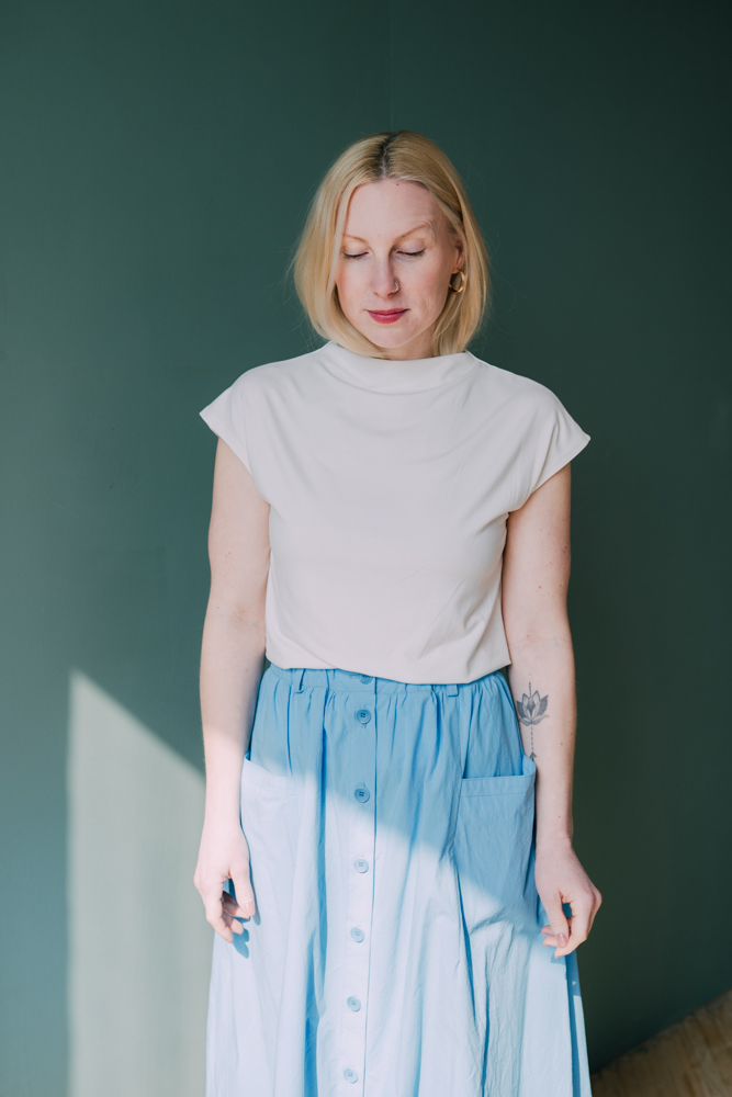 Propínací Linu z mačkaného popelínu můžete nosit i částečně rozepnutou, do poutek dát pásek a do velkých kapes cokoliv, co potřebujete. Fajnšmekři si všimnou zajímavého prošití kolem prvního knoflíku a minimalistického řasení.