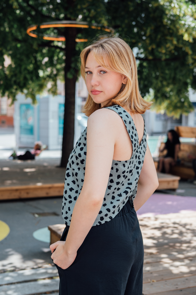 • Tričko Odetta = užší hlubší véčko, stojáček vzadu