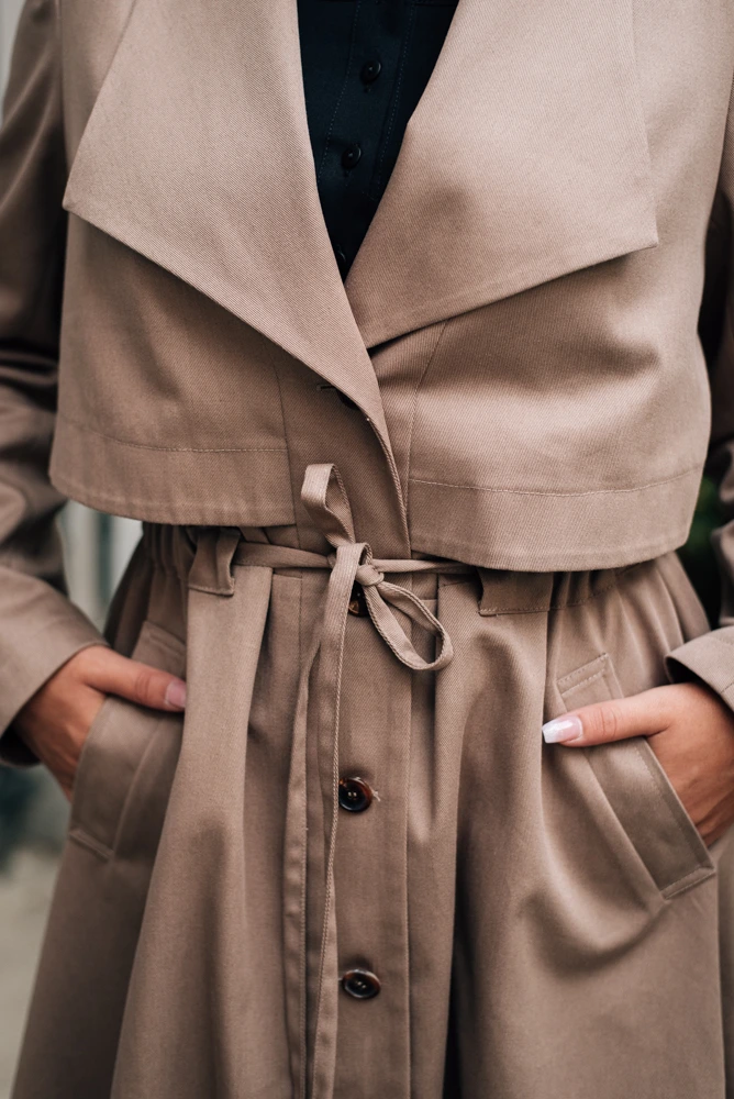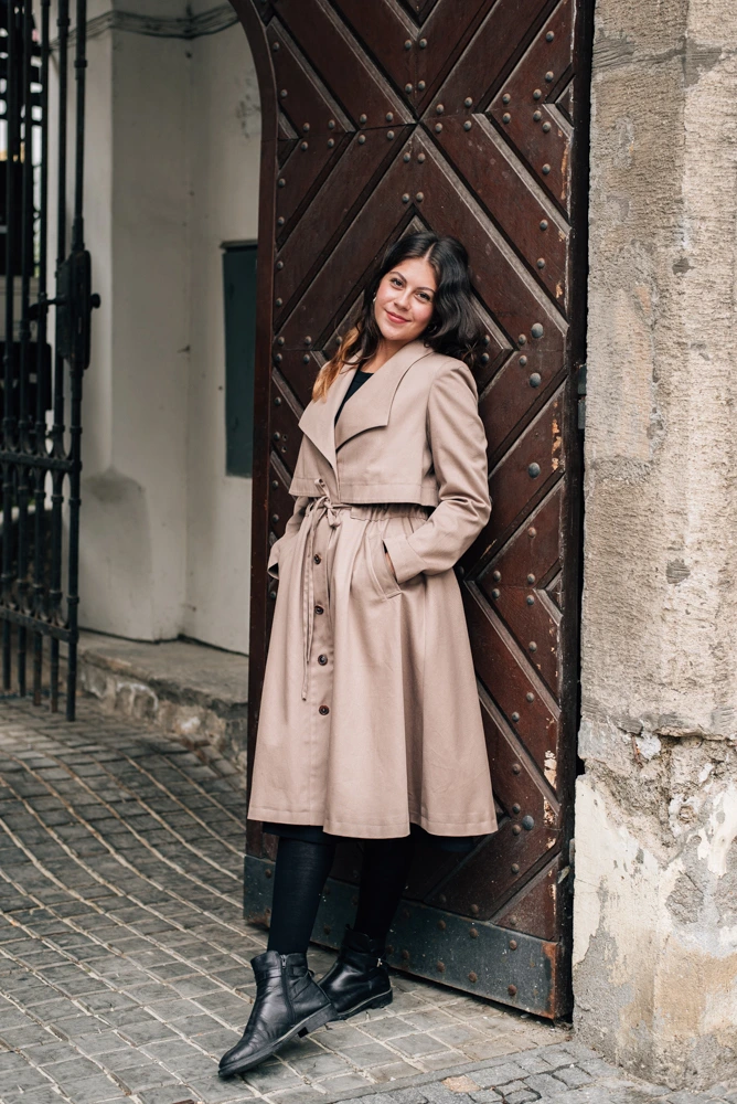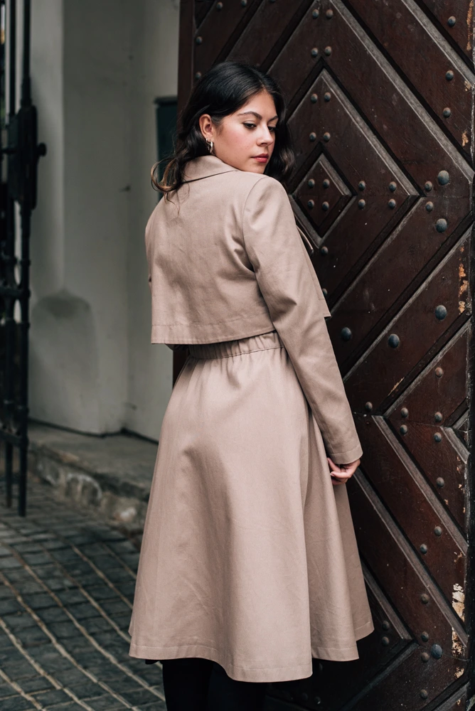 Podzimní kabát je spíše elegantnějšího ražení s lehce retro nádechem. Hodí se ke všem kouskům z naší nabídky. Líbí se nám kombinace tón v tónu s černými nebo béžovými kalhotami Mila. Velmi se hodí i k sukním Celeste či šatům Sandra.
