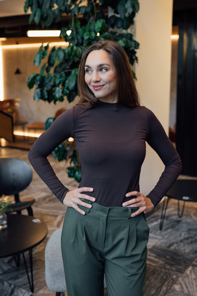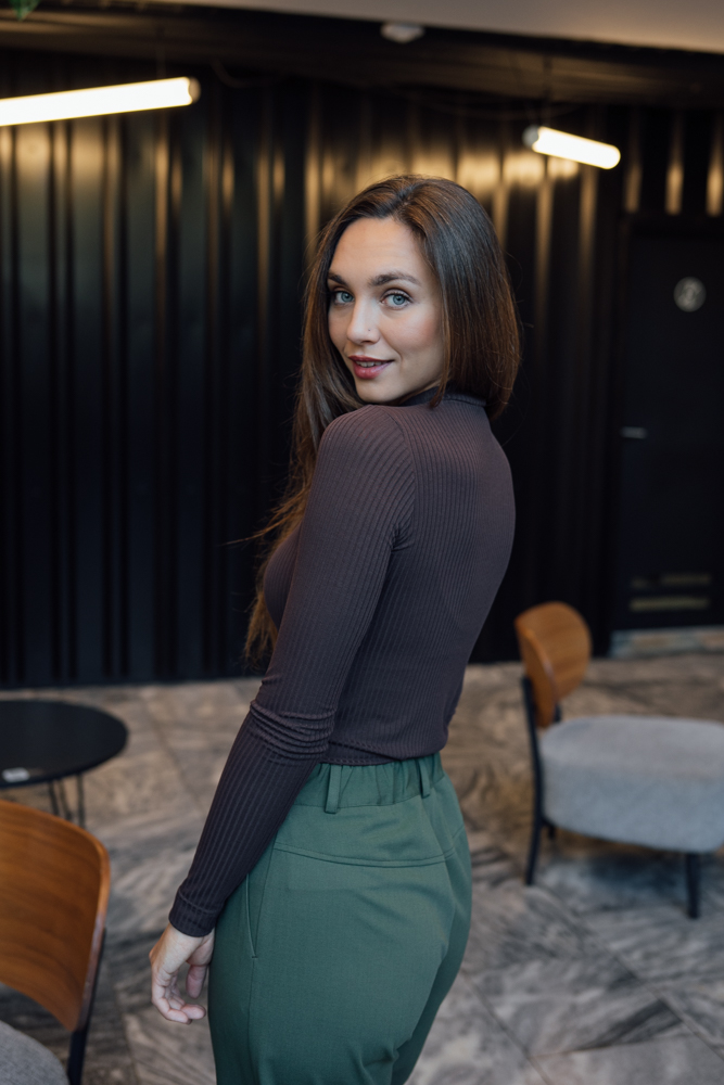 Elegantní žebrované tričko se skvěle hodí ke culottes. Parádní business outfit vytvoříte s kalhotami Mila nebo Aida.